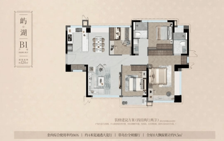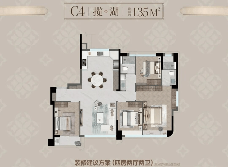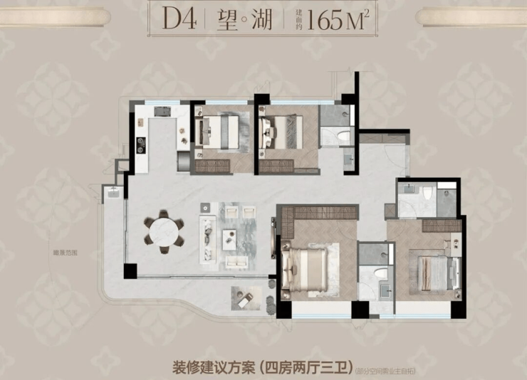 •瑞湖公馆主力户型有三居室和四居室,三居室建面约96㎡,为3室2厅2卫;四居室建面有124㎡、133㎡、165㎡、167㎡、172㎡等,均为4室2厅2卫或4室2厅3卫布局;