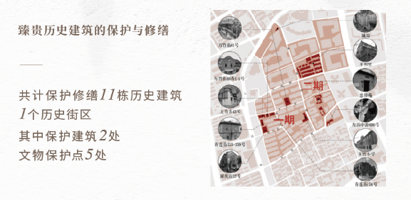 露香园境内拥有共计11栋保护修缮的历史建筑、1个历史街区,其中保护建筑两处、文物保护点5处。