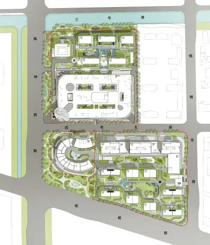 整个综合体园区采用现代的布局手法,以“三轴两园七境”为原始思路。以中心大景观为主轴线,点式景观向中心聚拢做串联。景观中心点明显,以大面积绿植为主,大面积的水景观更增添了小区内部趣味性,并以遮阳廊架点缀,设置儿童游乐园,强调互动空间的营造,规划形态层次分明,打造多层次立体景观体系,营造优质的生态社区环境,形成一流的社区品质及城市形象。