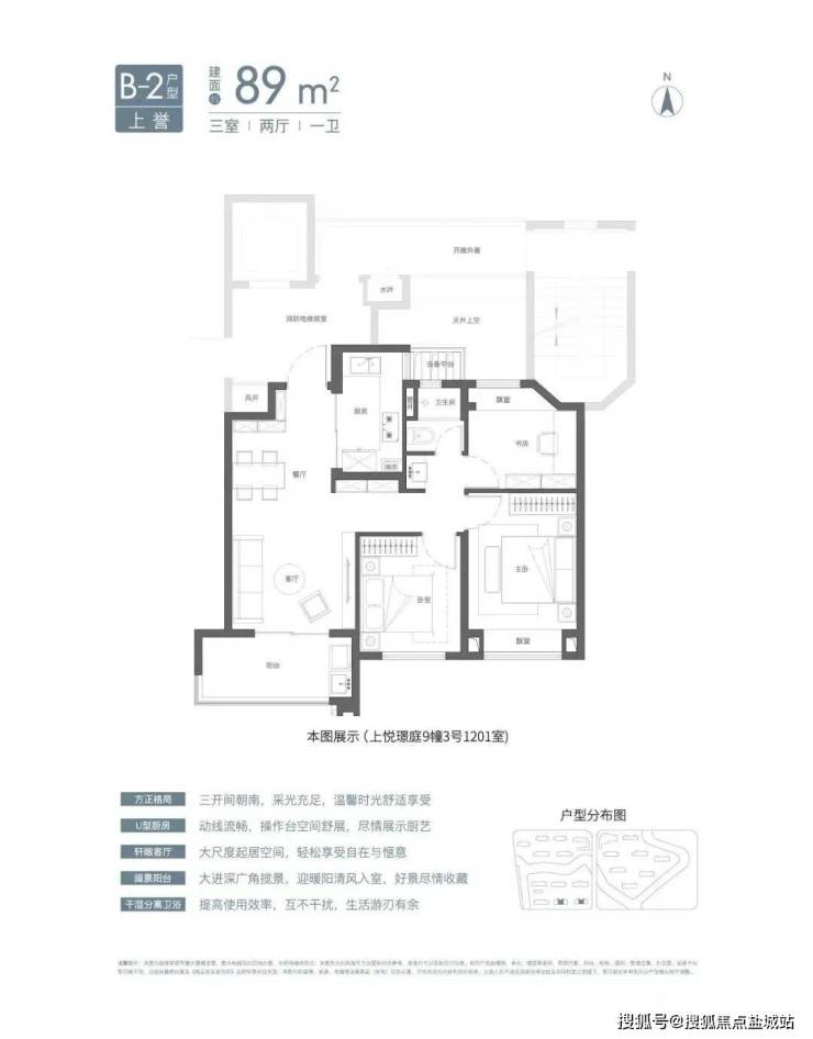 户型做了三开间朝南,采光充足,通风条件优越。飘窗的设计,增加了更多储物空间;大面积的景观阳台,可以肆意装点生活的乐趣。