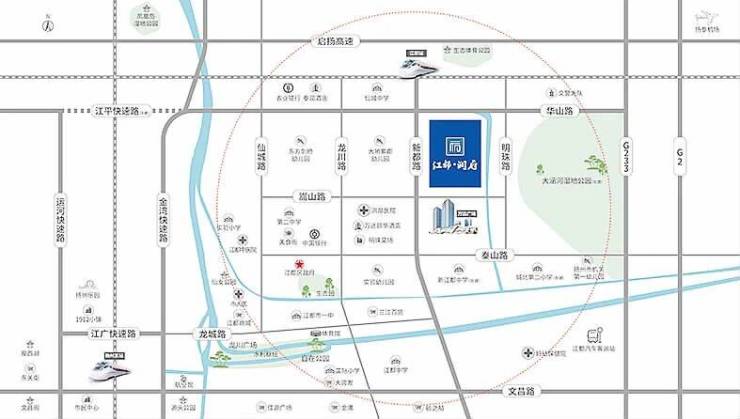 江都·润府位于新都北路以东、嵩山路以北,与万达广场仅一路之隔。项目周围学府环绕,实验幼儿园、东方剑桥幼儿园,仙城中学、第二中学、城北小学,未来江中也会搬到城北教育集中区,从幼儿园到高中满足置业者一站式的教育需求。万达颐华酒店、洪泉医院、明珠菜场、美食街距离项目约百米,周边设施齐全,生活气息浓厚。项目外围双面环河,享有丰富的沿河景观,并且板块内还规划了约400亩的大涵河湿地公园,让业主尽享城市绿色生态。