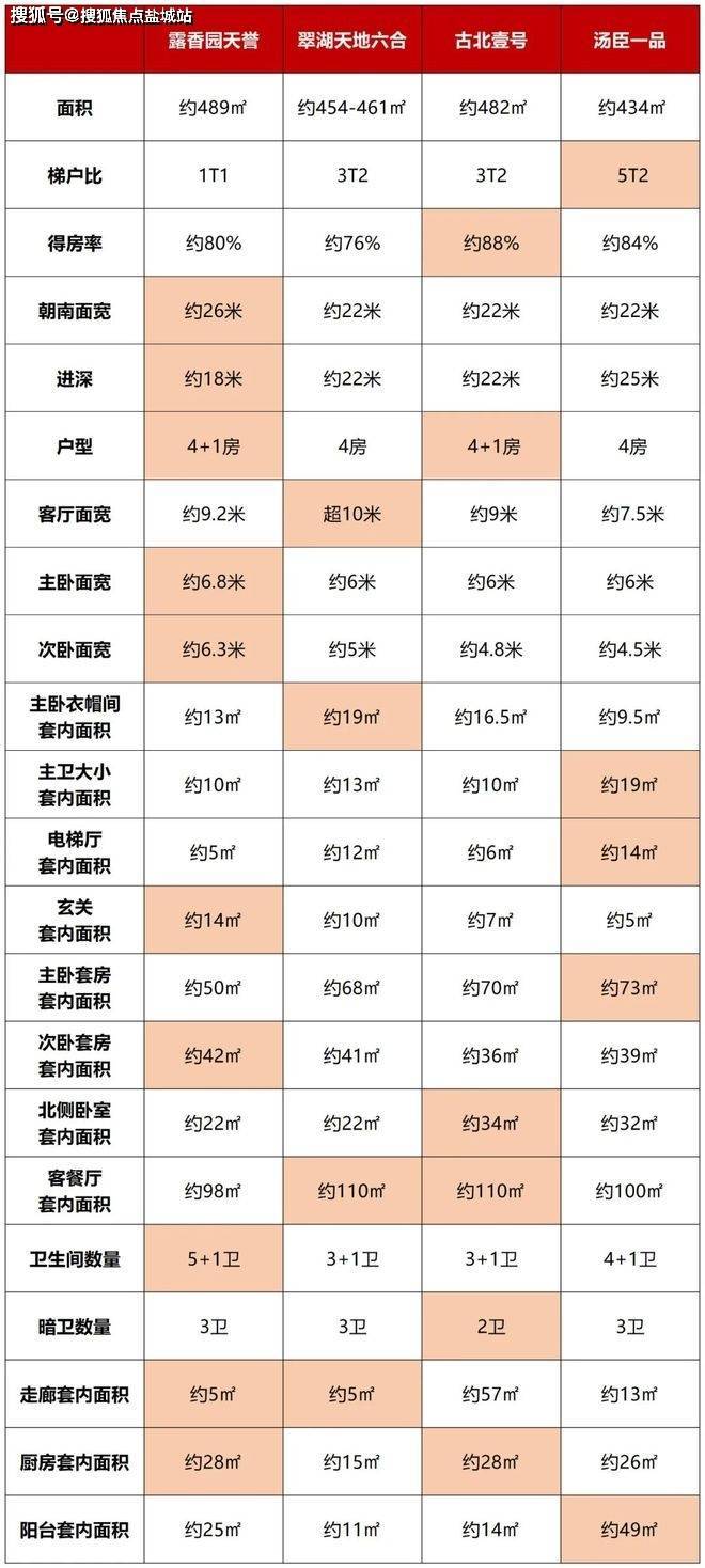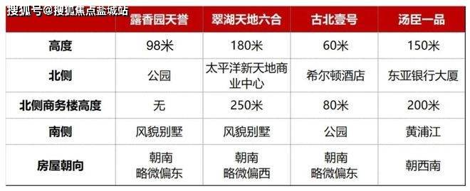 楼典横向对比了上海指标性的亿级空中平墅产品——翠湖天地六和中间套约454-461㎡、古北壹号约482㎡、汤臣一品约434㎡与露香园·天誉约489㎡的各项参数,这三个产品的一手、二手价格均在亿级或以上,得出以下结论: