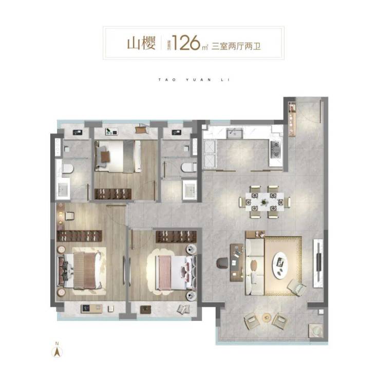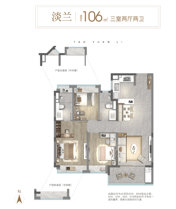 106㎡3房则做到“真三房”,不是市面的“2+1”,而是每个房间都能做卧室;约3.45米客厅面宽、开放式可视厨房、南向大阳台,让家庭公共活动空间更显开阔。