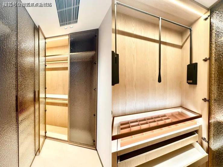 L型衣帽间同样是交付标准,下拉式衣架、感应灯光十分人性化~