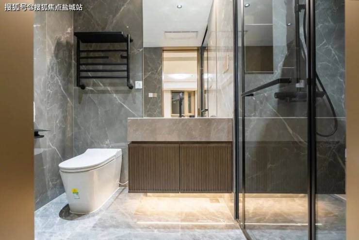 卫浴空间打造也是满满的豪宅品质感,卫生间均配备了智能马桶和电加热毛巾架、淋浴房、花洒均是科勒精选系列,主卫为香槟金色,细微之处见真章!