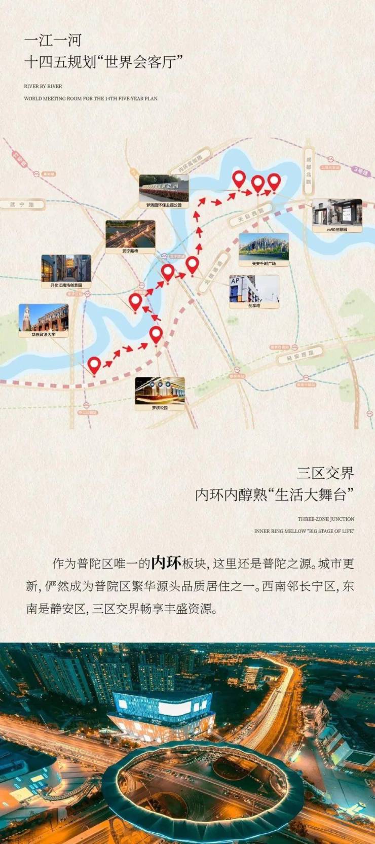 从泰唔士河、巴黎塞纳河、哈德逊河,到中国香港浅水湾、深圳湾、上海一江一河....世界鼎流生活,不可复制。在上海,黄浦江岸已然完成了外滩洋场、陆家嘴灯火辉煌、前滩崛起、徐汇滨江艺术人文的完美落地。而上海母亲河一苏州河,正以“世界级滨水区”焕新之态,将成为“未来世界会客厅”。
