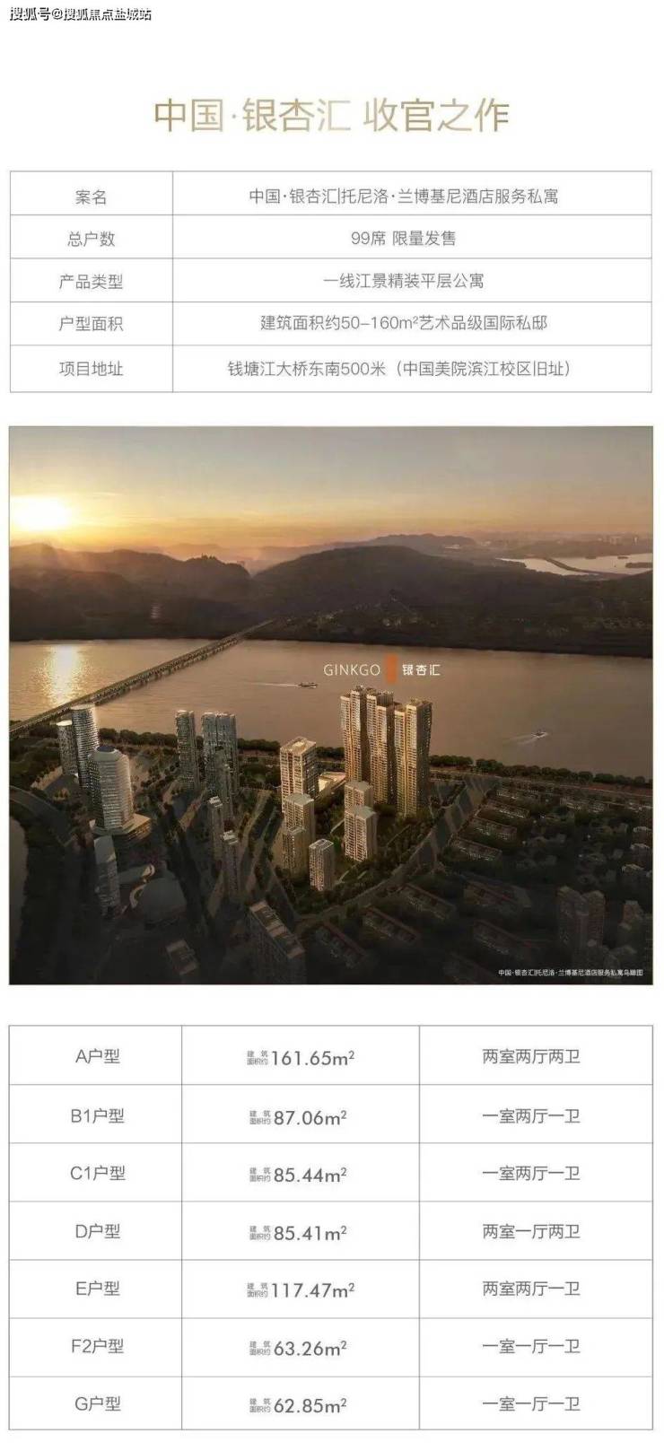 杭州银杏汇,类型:酒店式公寓,产权:40年,地铁:杭州地铁4号线(联庄站600米),总户数:首开90席,户型:平层公馆、4+1梯13户,层高:3.6米价格:预计5万,面积:50-80-120-160方(5-12层),精装交付7000元/方(硬装),交付时间:2021年中旬,物业:兰博基尼酒店管理服务(8.8元含能耗)