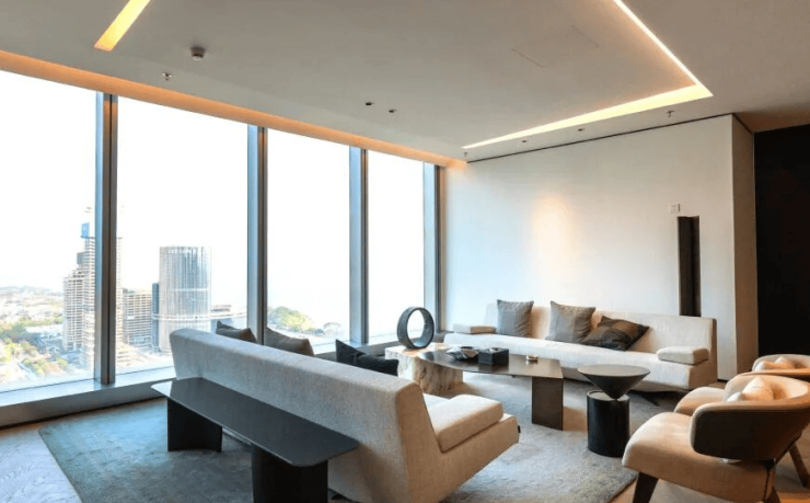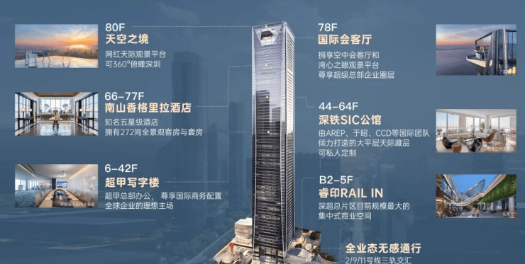 ◎约358米总部旗舰,总建筑面积约63万㎡,集建筑面积约10万㎡睿印RAIL IN、南山香格里拉酒店、深铁SIC公馆、超甲级办公、国际会客厅、天空之境等垂直功能于一体,集合全维旗舰配套,满足全时段商务需求。
