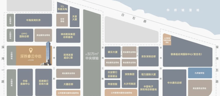 深超总是深圳唯一以“超级总部”冠名的区域,目前汇聚中国电子、OPPO国际、招商银行等总部企业、深投控、中信证券等世界500强企业,规划打造影响世界的超级产业矩阵。