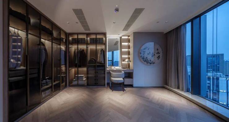 约450㎡“香奈儿”西边套,将原本多见于餐桌和墙面的白金沙奢石,漫铺于双厅地面之上。浅淡得宜的洁白,温润如玉的蜜色,将空间衬得时髦优雅。能眺望钱江两岸的梦幻天际线,“宇宙中心”奥体尽收眼底,也能俯瞰城市霓虹,车水马龙就在脚下。整个中心的璀璨世界定格在落地窗前,像一张巨幅明信片。