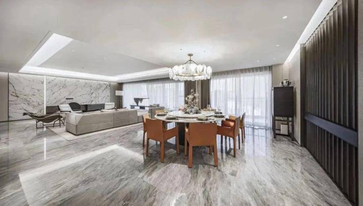 约440㎡“宝格丽”东边套,则化身黑与白的经典碰撞。喜马拉雅灰大理石和拉丝橡木饰面的丝丝入扣,诠释了不同材质的平衡之美。不论精装品牌或用材工艺,项目极尽高配之能事,装标达惊人的约15000元/㎡。