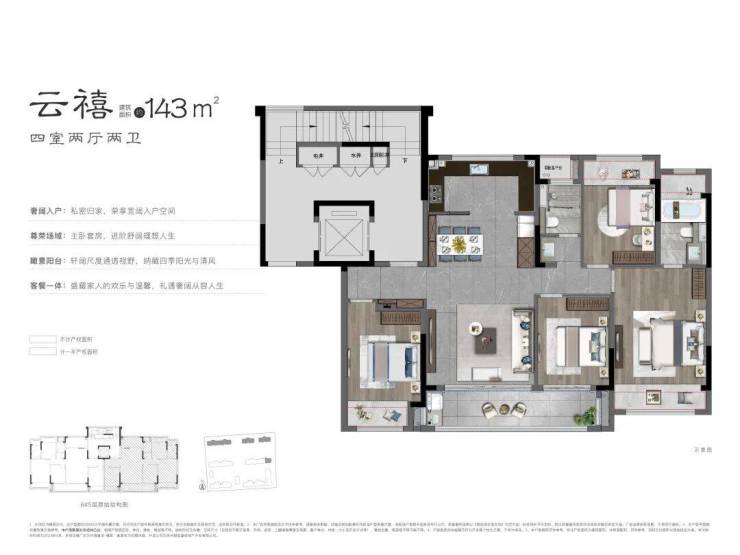 143㎡户型是4房2厅2卫,3卧朝南,双联阳台,属于比较优秀的格局。