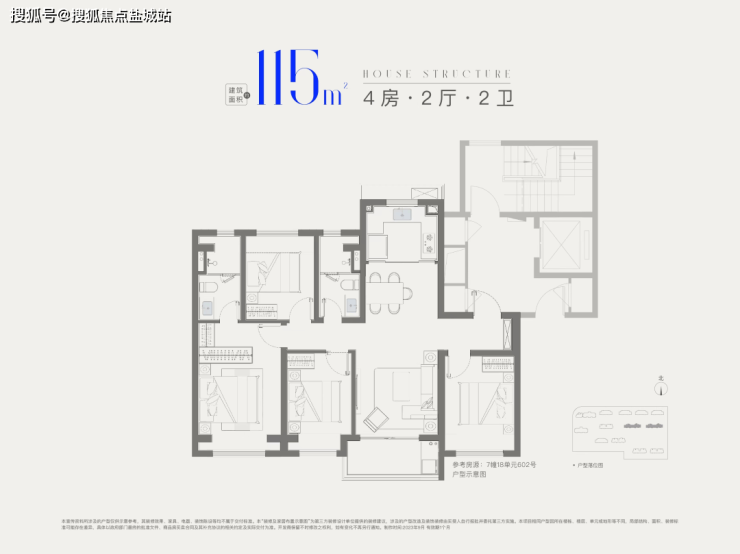 建面约115㎡4房2厅2卫,做到了四开间朝南+全卧室带飘窗+主卧套房设计,一步到位的大四房户型。兼顾大4房的功能性和空间尺度,非常难得,更适合四口之家或三代同堂家庭居住。