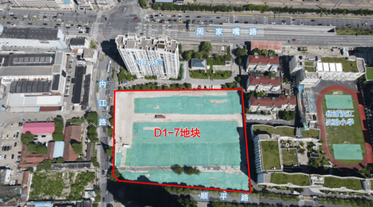 地块东至上师大附属杨浦滨江实验小学,南至顺平路,西至内江路,北至内江公寓,出让面积14958.66㎡,容积率2.5。