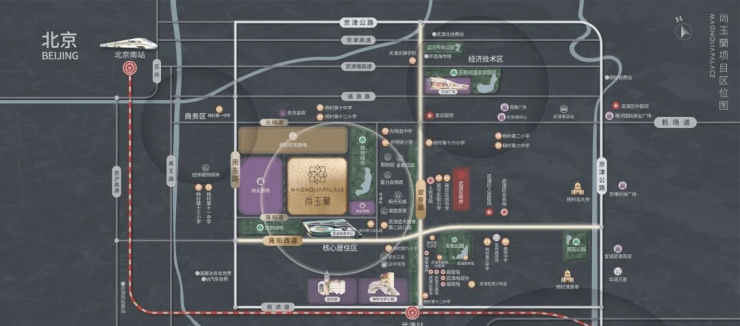 一横一纵:城市中轴线翠亨路,与政商黄金线雍阳西道交汇之处,集萃城市鼎峰资源双核双心:武清资源向西集萃,近武清区政府,对望体育中心,形成城市物理内核&人文精神内核;体育中心板块,传统豪宅区,菁英生活中心超维配套:奢质生活版图,佛罗伦萨小镇、V1汽车公园、威尼都、万达广场、武清区人民医院,生活配套近揽优渥5431立体交通:毗邻武清高铁站,高铁到达北京南站仅需22分钟,到达亦庄站仅需16分钟,直达天津站仅需14分钟;毗邻城市主轴雍阳西道与翠亨路,快速通达武清政务区、商务区、开发区等城市级板块;三大高速织就立体路网,快速畅达京津冀核芯城市群,悦享便捷人生。五纵-翠亨路、翠通路、南东路、高王路、京津公路四横-雍阳西道、雍和道、前进道、光明道四个城市级主干道 三高一铁-京津塘高速、京津高速、京沪高速、京津高铁武清站活力主场:生态绿廊公园、规划绿地公园、体育中心运动场,富氧生活澎湃活力。全龄教育:英华三幼、光明道小学、光明道中学、杨村一中,近享全龄优教资源。