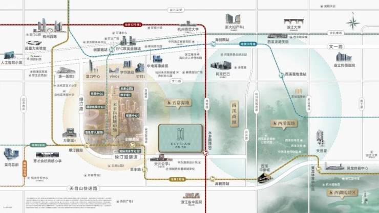 一核双轨:12号线水乡南站(在建,预计2027年底投入使用)(直距约40米);3号线全丰路站(直距约1KM),12站到黄龙体育中心;地铁五站达杭州西站,以西站为核心构成了杭州长三角一小时交通圈的雄心