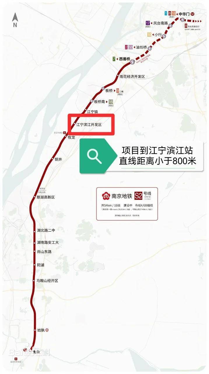 项目紧邻规划中的S2号线江宁滨江站,5站换乘7号线,6站河西南,9站河西中。