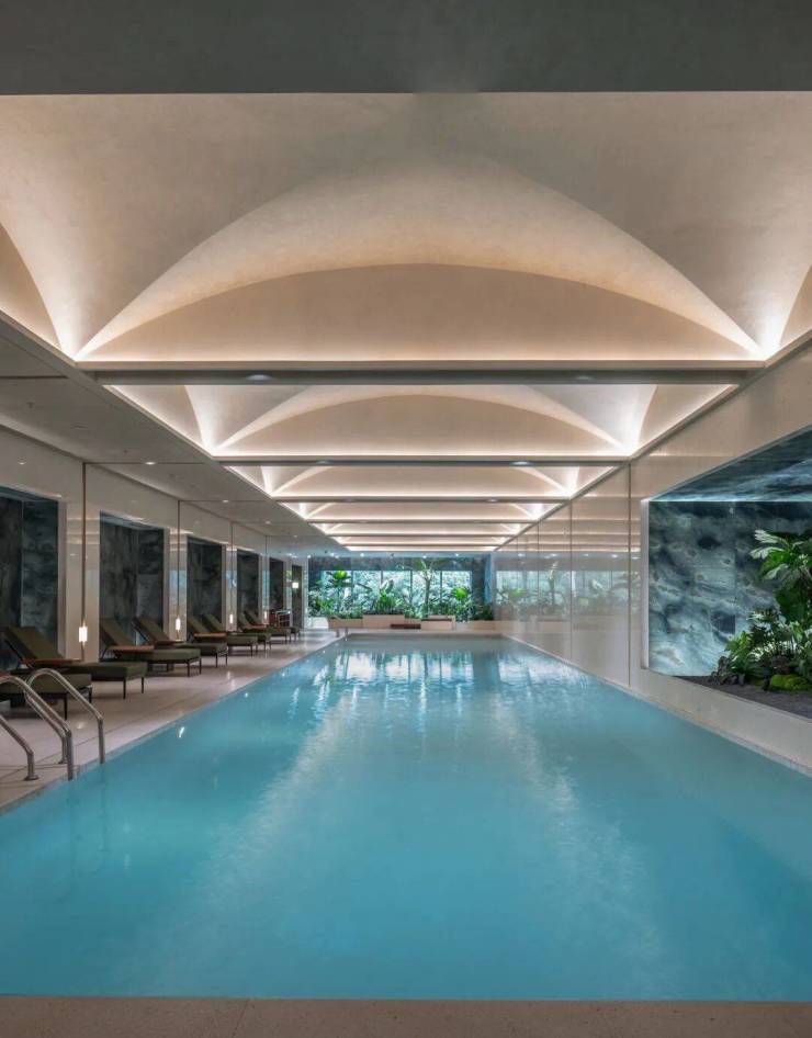 豪宅中,会所+泳池已经成为市场标配。但是万科中興傲舍,真正做到了 “把艺术作为生活的一部分” 。植物园泳池放在了2楼,选用了皮革面的绿色石材,营造一种树影斑驳的感觉。里面的绿植不是装饰,都是鲜活的、精心照养的。
