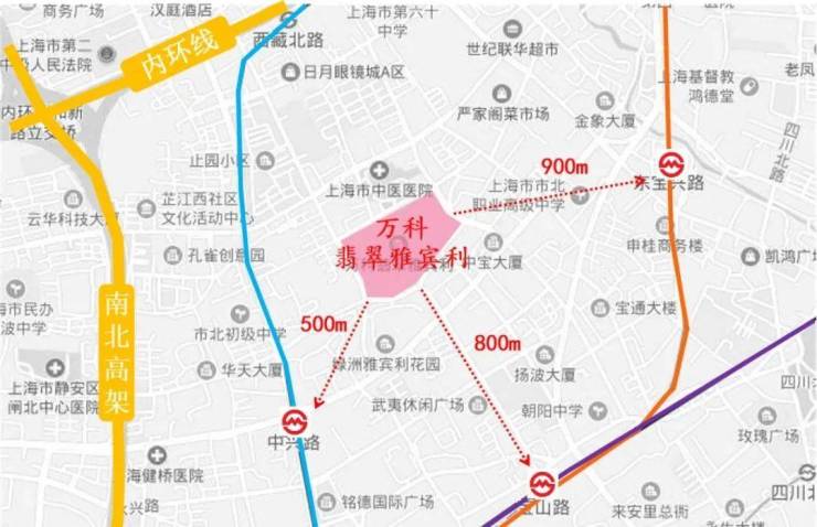 项目距离轨交8号线中兴路站仅500m,两站路即可到达人民广场;距离4号线宝山路站约800m,3号线东宝兴路站900米,项目1km距离内拥有3条轨交环绕,出行非常便捷。
