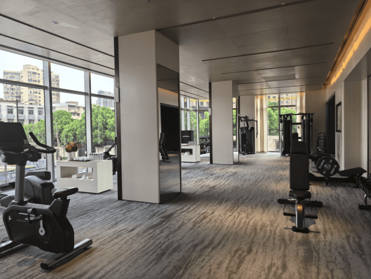 二楼通过专业餐酒吧设备、艺术光厅、上海首个度假感植物园泳池等营造艺术感会所。并围绕女性业主的需求打造女性友好健身房,专属设计了适配女性的器械,例如 Eleiko 多功能架、瑜伽室、补妆间等,并配置了健康管理服务。