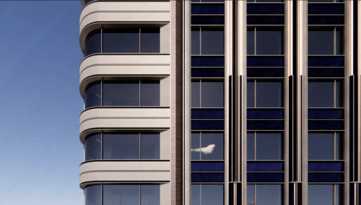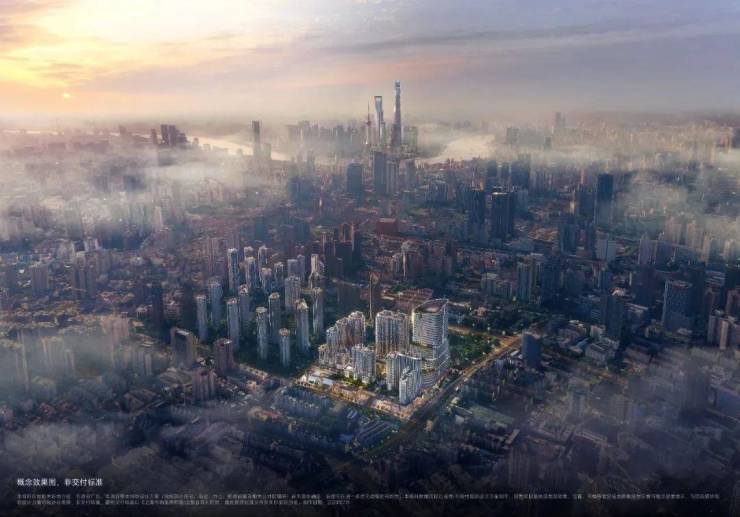 外立面方面,项目整体将打造为新海派建筑地标,设计有弧线阳台、45度玻璃、双层塔冠等,设计灵感来源于蔓楼兰;立面色调方面,将采用珐琅彩色调,具体或为珍珠蓝铝板+红色纹理+金色线条,具体材料及配色还在最终确认。