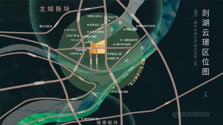 北依剡湖,西傍剡园,南眺剡溪,剡湖云璟傲踞主城核芯板块,周边汇聚城南小学、马寅初中学、嵊州中医院、文化广场、罗星公园等精粹资源,坐拥醇熟主城生活圈。项目倾力打造建面约110-185㎡瞰景大平层&舒居小高层,中高端改善型住宅产品,以精致建筑致敬嵊州上层客群,助力主城迭代升级。