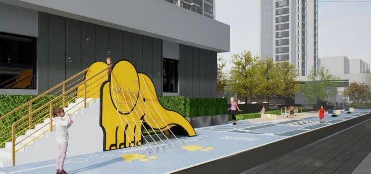 通过大草坪、水景雕塑结合休闲廊架,打造度假感室外会客厅。充分利用消防登高面,通过移动树池、户外家具等,结合铺装,打造邻里会客厅。
