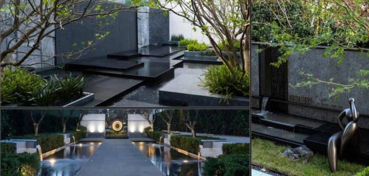 主入口以深色LOGO景墙,简洁而富有设计感,强调迎宾仪式感。二进花园树阵强调出轴线仪式感,端头以仪式感景墙结合水景叠水收尾。