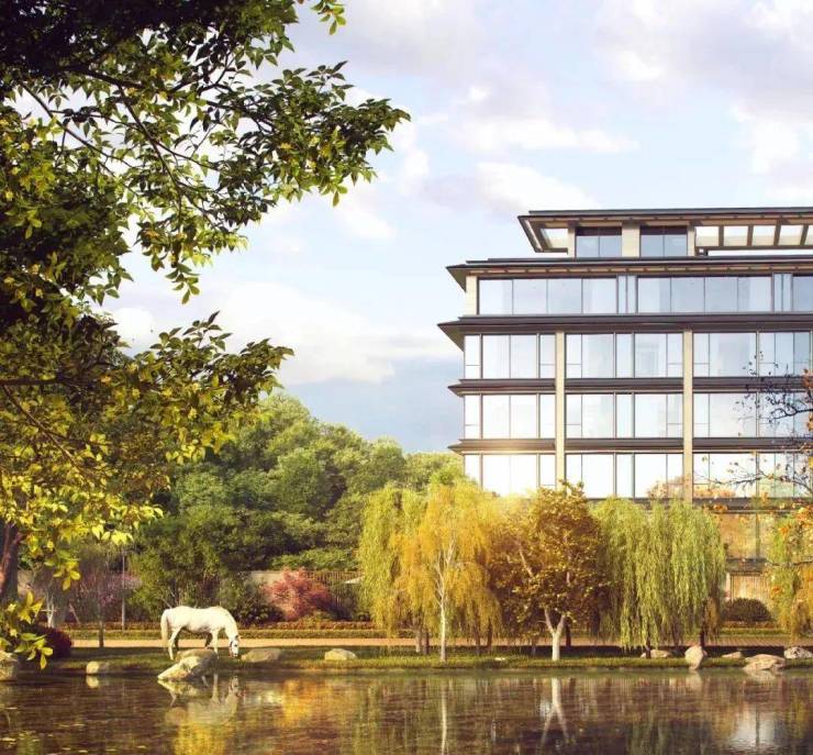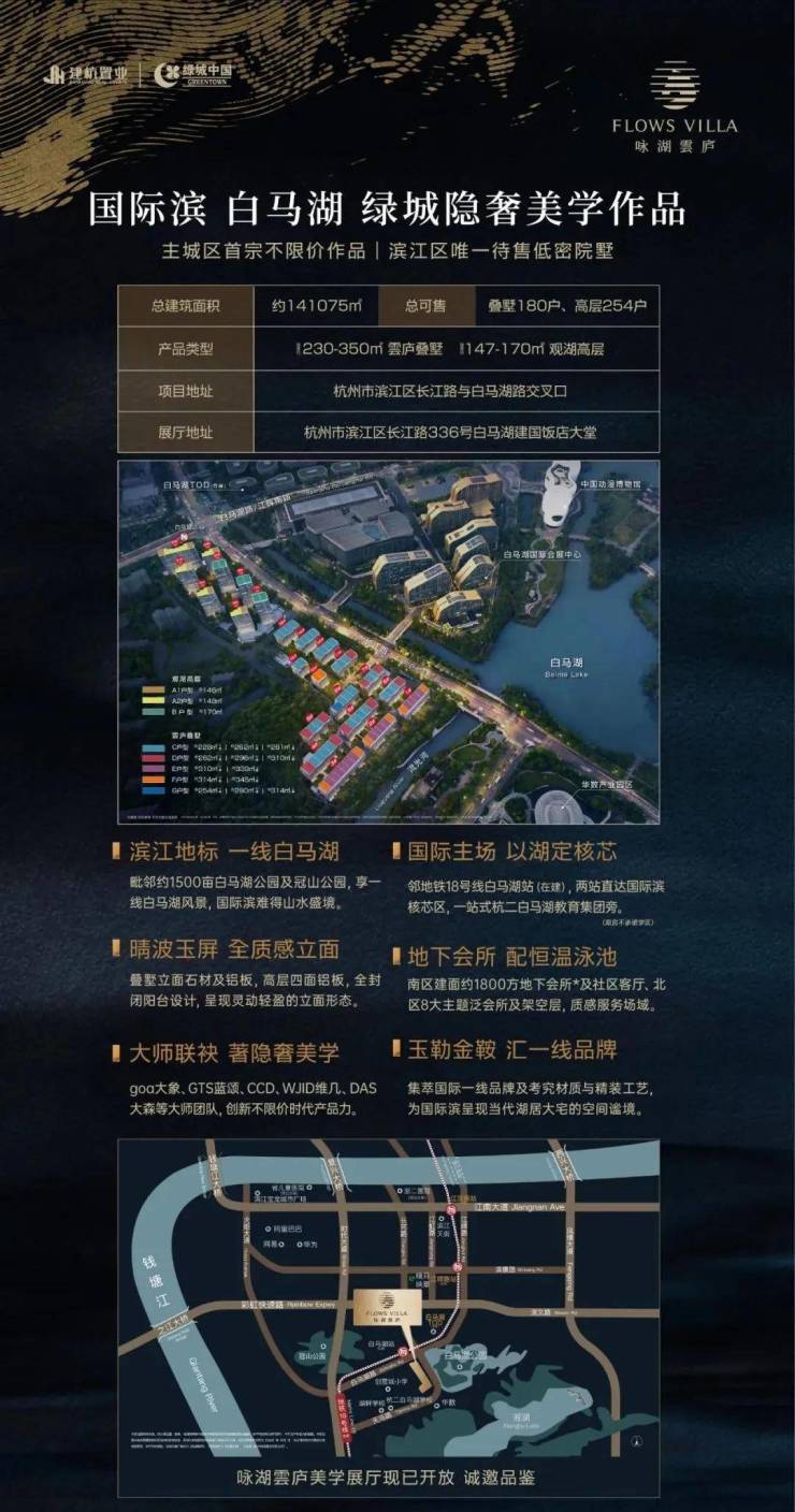 延续绿城营造精髓,咏湖雲庐以整体化的立面形态,呼应"白马晴波,玉屏烟树"的湖畔诗画意境,为国际滨而定制,倒映白马湖的一片云。