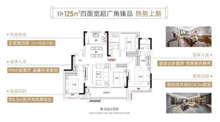 以更合理的空间、更具功能性的户型规划,建筑面积约125㎡四面宽超广角臻品热势上新,全周期四房一站式满足二人世界、三口之家、三代同堂等不同家庭结构改善所需,代言经开改善。