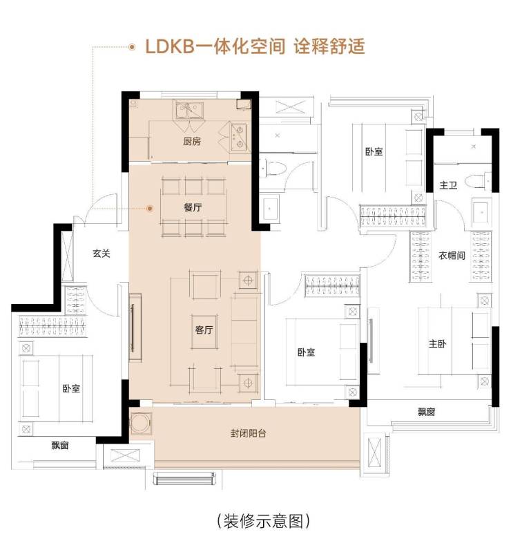 餐、客、厨、阳台一体化设计 ,不仅有效提升空间利用率,各功能区也彼此贯通,形成多重洄游动线,有机连接各生活场景,为家人创造更多沟通、陪伴和互动的情境。