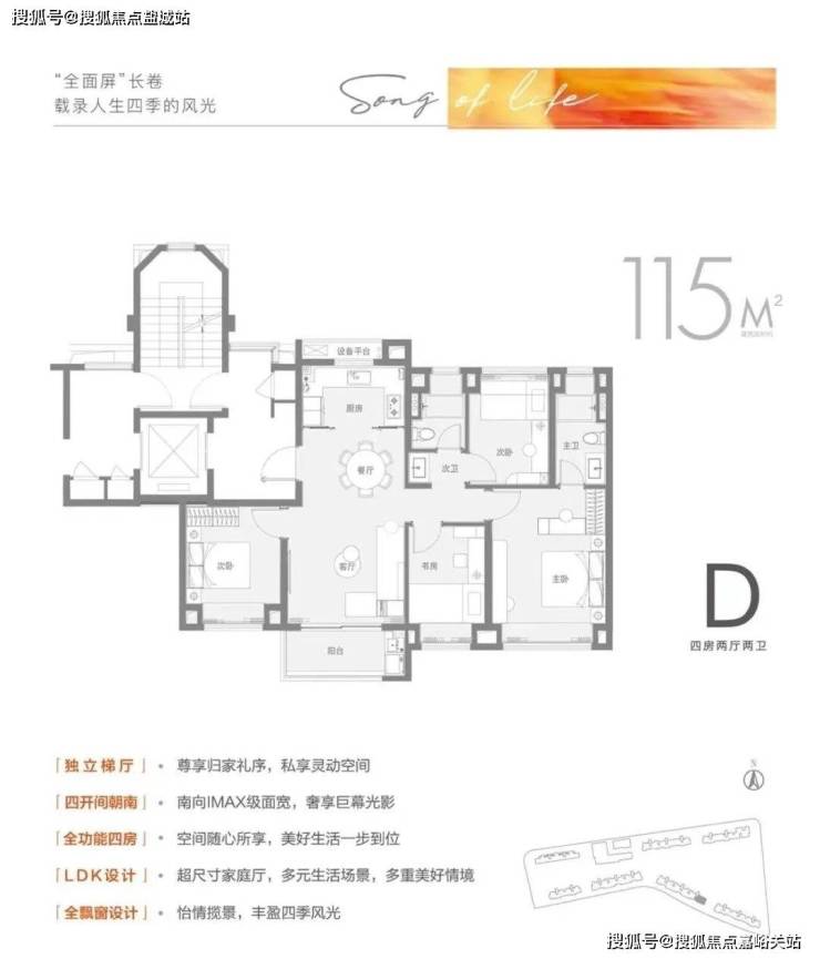 建面约115㎡4房2卫户型做到了同面积段罕见的四开间朝南+四房设计,南向IMAX级景观面,卧室阳光满溢,功能性也拉满。功能性十足的同时也不失舒适性,主卧南向大面宽+贯穿南北。