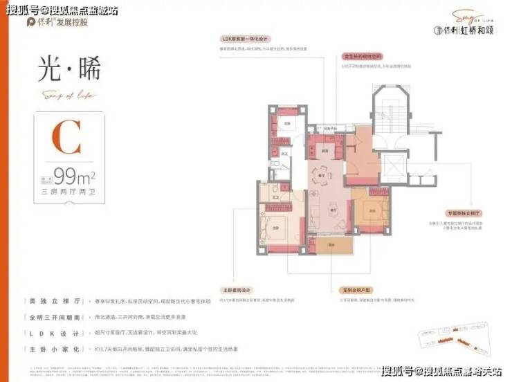 户型设计上,保利虹桥和颂,品质改善为出发点,设计“私属、至臻、尊崇”三大产品理念,臻奢建面约75㎡户型,三开间朝南,阳光与清风为伴,玄关+餐边柜+飘窗,全能收纳,卫浴三分离,干湿有别,奢阔餐客厅一体,空间明朗,动线流畅。