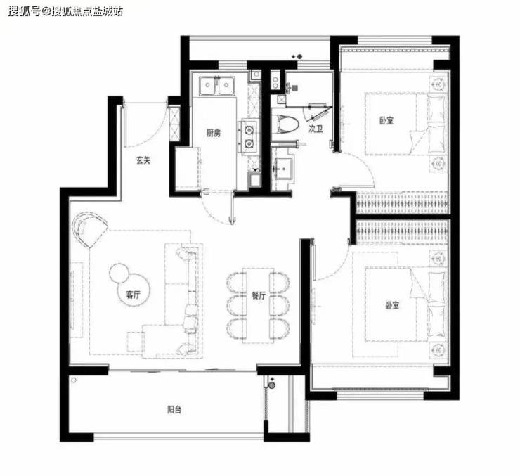 建面约83㎡的洋房户型,迎合了目前市场的主流,做到5.8米大面宽横厅,客餐厅一体化的设计,连接宽景大阳台。同时一南一北两间卧室,均带有飘窗,采光进一步延伸。干湿分离设计,更加科学高效。