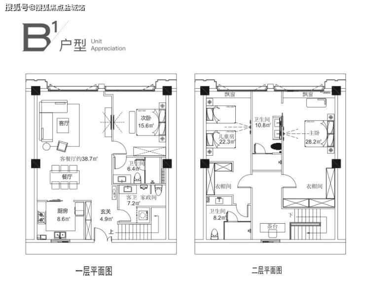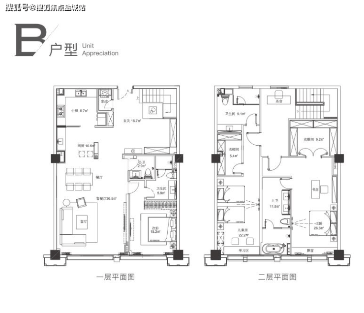 B户型:客餐厅一体,主卧带书房,中西厨,大衣帽间