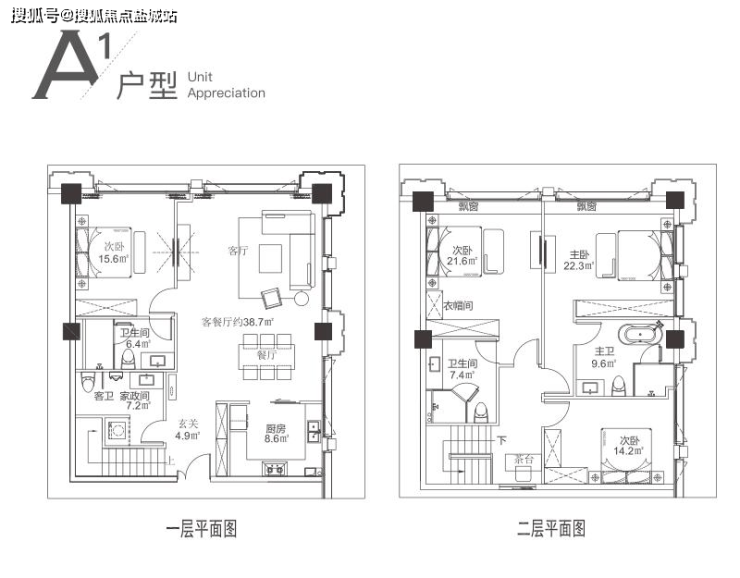 A1户型:180度全景采光,超大尺度一体客餐厅,奢阔主卧。