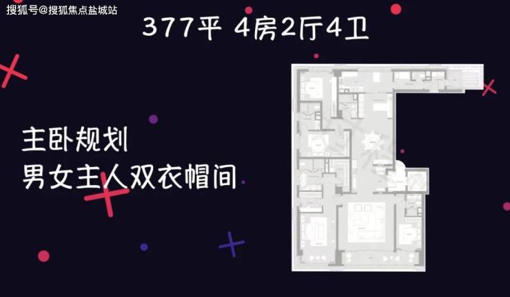 建面约377平户型,主卧规划了男女主人双衣帽间,比较匹配豪宅业主的真实需求。