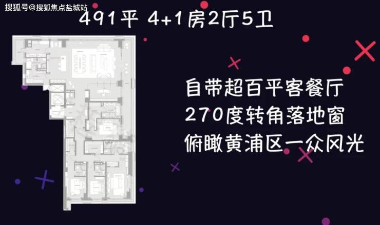 主力建面约491平户型,自带超百平的巨幅尺度客餐厅,搭配270度转角落地窗,可以俯瞰黄浦区一众风光。