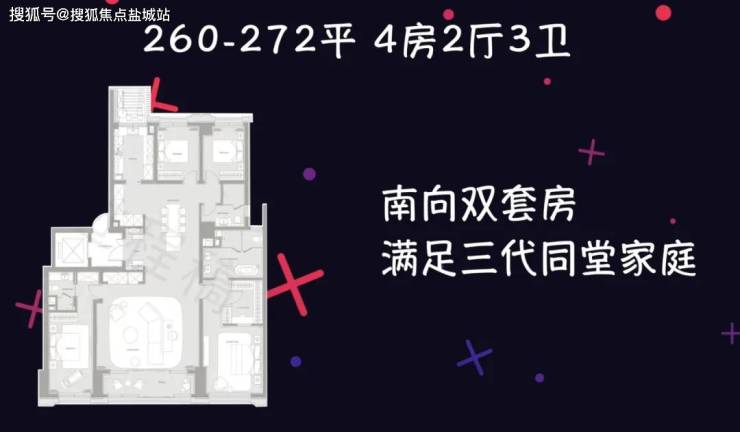 即使是建面约260、272平的起步户型,也都设计了南向双套房,可以满足三代同堂家庭客户。