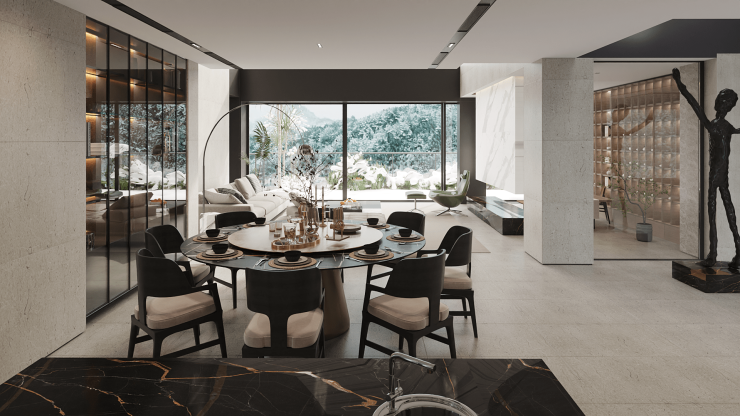 双首层入户一层,作为会客接待的私属领域,可归置约30人的客厅聚会,挑高私宴厅配置专业厨房,同时相连着阳光花园、泳池;入户二层,则构成家庭共鸣的流连忘返之所,客厅三面270°环绕落地玻璃窗延湖面延展,凭窗望湖,看山色自朝至暮缓缓移动,林间流莺婉转,阳光铺在水面上,泛着点点金光,水纹远远地向远处延伸,随之人们的心胸也豁然开朗.