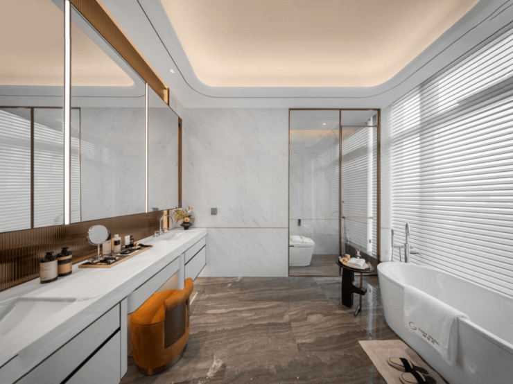 外观立面是全面屏组合窗铝板幕墙,消隐建筑线条,金属与设计碰撞出未来感,尽显高级品味。步入御钱湾生活美学馆,绵延水韵凝练的“隐奢度假”诗境浑然天成。