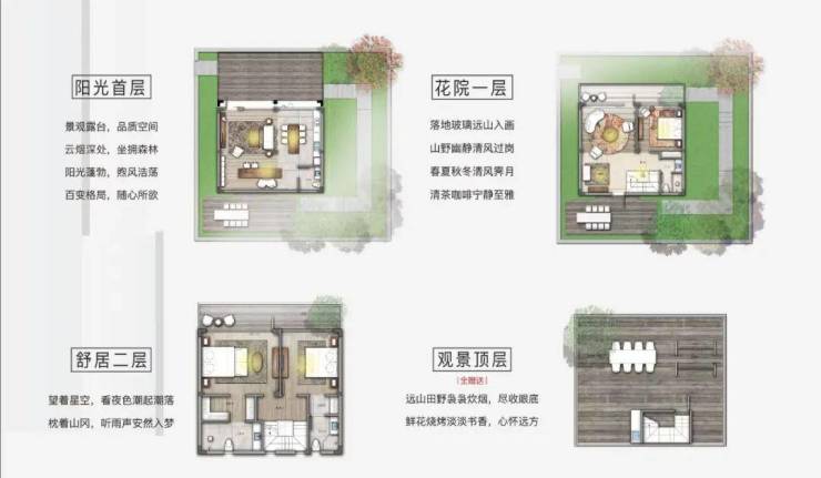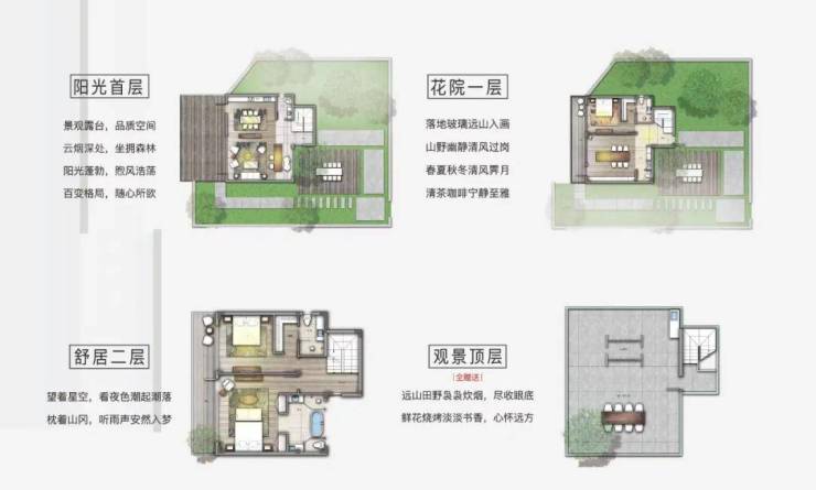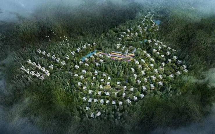 整个项目规划为四个片区,云顶项目只是整个度假中的一个山墅居住组团,为了解决业主的吃喝玩乐的问题,云顶后期规划开发有私人会所、度假酒店、农耕体验、康养中心、娱乐中心、特色民宿等功能配套。