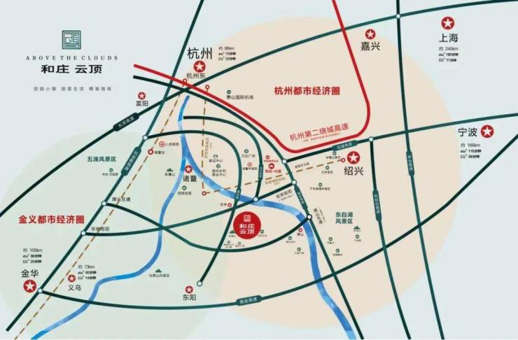 和庄·云顶项目位于诸暨市暨南街道,杭州开车只要1小时左右,距离项目4公里就有高速出入口,可以从诸永高速街亭出口直通杭州二绕。