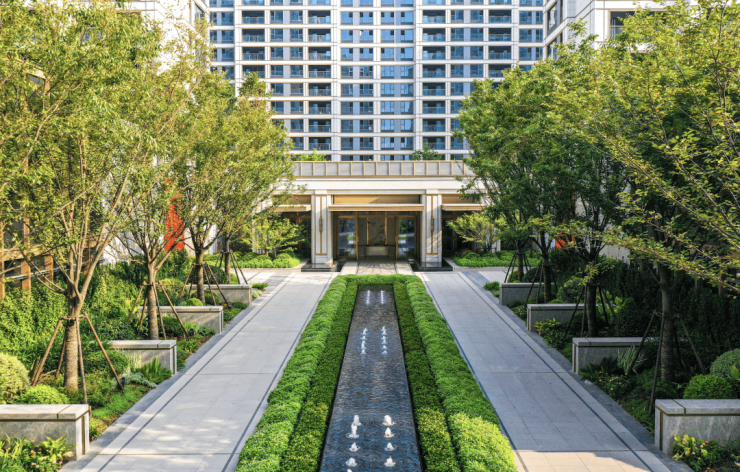 入口中轴对称式的前厅水景,两侧阵列由榉树围合组成,不仅拥有“门前中举”的美好寓意,也让入口的仪式感拉满,与灵动的喷泉水景交相辉映,形成具有东方礼序的归家体验。