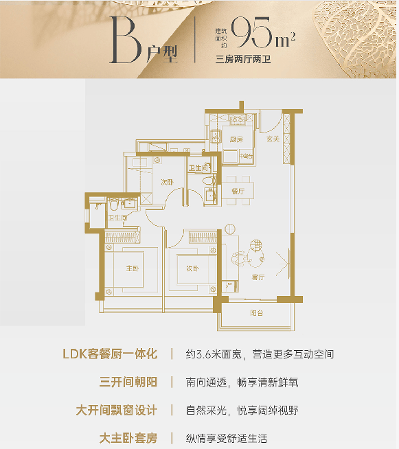 建面95平米 B户型:3房2厅2卫,传统的竖厅户型,动静分区。户型图没有尺寸,没有办法具体分析各个功能间的大小;不过小编实地看过样板间多次,只能谈谈感受。整个户型得房率中等,像这种超高层,有2层避难层,还是3T6户,整体的得房率都不会太高,不包括赠送的情况下得房率一般都在75--78%左右,闻华里也在这个范围,三个房间的飘窗设计的比较合理,在和墙壁连接处,没有出现较大的凸起部分,比较好利用;主卧和独立卫生间出现门对门的情况,部分购房者会在意。总的来说,这个户型没有太大的缺点,也没有十分突出的优点。