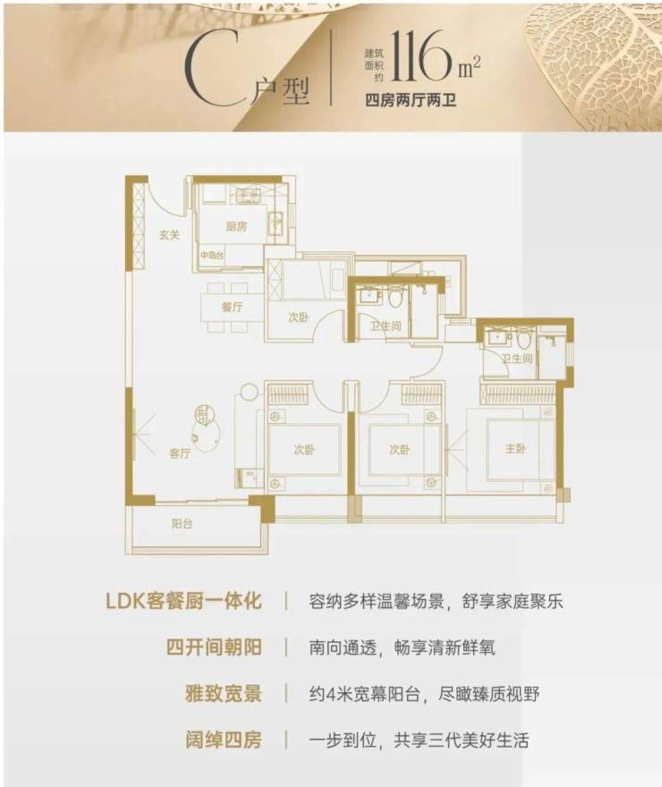 建面116平米 C户型:4房2厅2卫,传统的竖厅户型户型,C户型可以简单理解为B户型的加强版,多了一个房间,其他的变动不大;需要注意两点,特别是潮汕地区的比较在意,第一,主卧和独立卫生间同样出现门对门的情况,第二,次卧和公共卫生间的门也是正对。整个户型设计十分中规中矩,各个功能间的大小还可以。