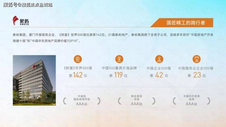 象屿集团,厦门市属国有企业,《财富》世界500强位居第142位。31载象屿地产,象屿集团旗下全资子公司,深耕长三角核心都市圈,享誉华东区域的精品住宅开发商,连续多年获评“中国房地产开发稳健十强”和“中国华东房地产品牌价值TOP10”。象屿地产位列2024年上半年全国销售金额第30位(操盘)、上海市场销售金额位列第17位(操盘)、苏州市场销售金额位列第一。