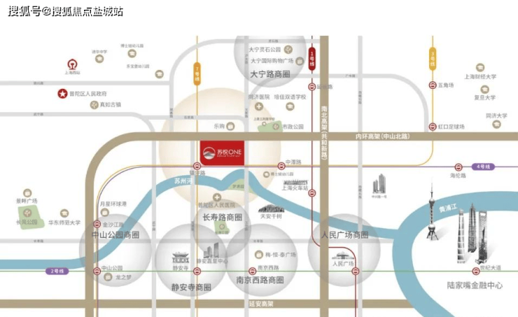 核心地段 内环内 全方位都市生活圈 苏悦ONE位于内环长寿路商圈,真如环宇城MAX、环球港、鸿寿坊三大全新商业地标环伺。项目集商务办公、餐饮娱乐、银行证券、商场于一体,构建了一个多元化、全方位的都市生活圈。