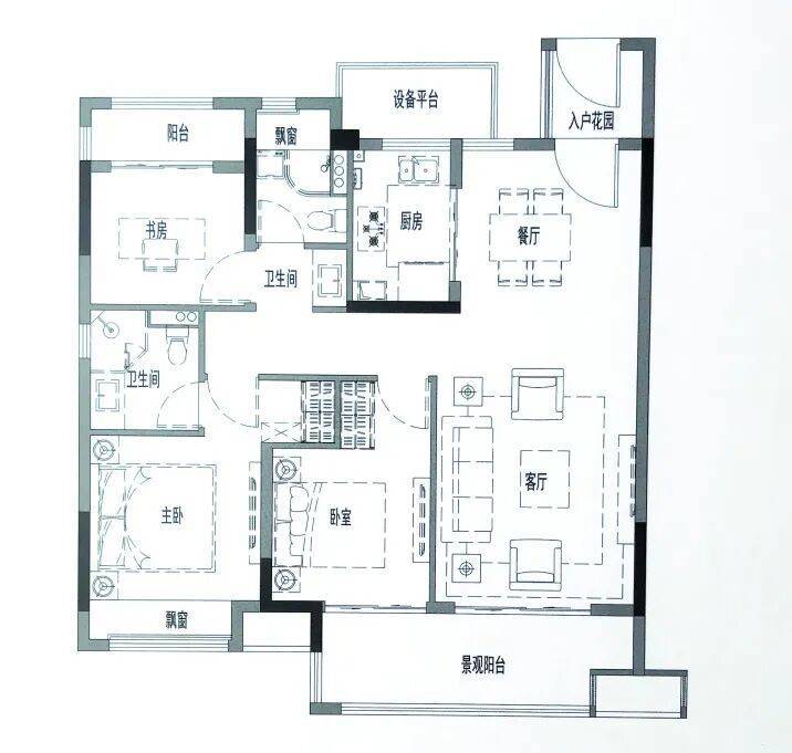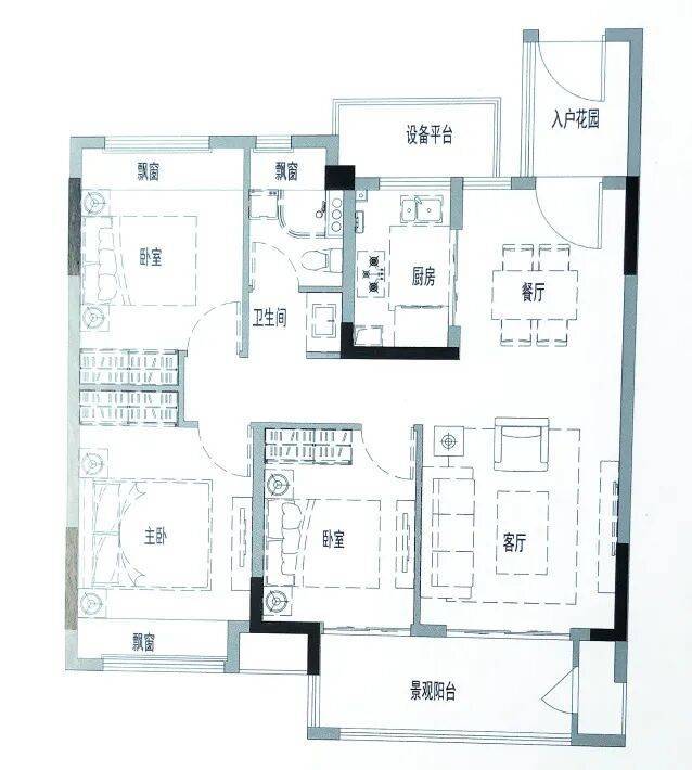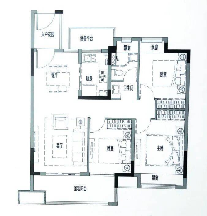 该户型三开间朝南,带有一个入户花园,更大的扩展了收纳空间,约6.2米景观阳台,未来可以供业根据自己的喜好进行打造,三个房间均带有飘窗设计,提高了房屋利用率,也让光纤更充足。