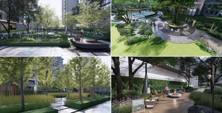 社区内部景观,除了叠拼部分的园艺小院和高层部分宅间花园之外,还设计了“两大四小”六个成规模的景观组团,分别是:月光宝盒、混龄光环、植物园及互动社交空间等。